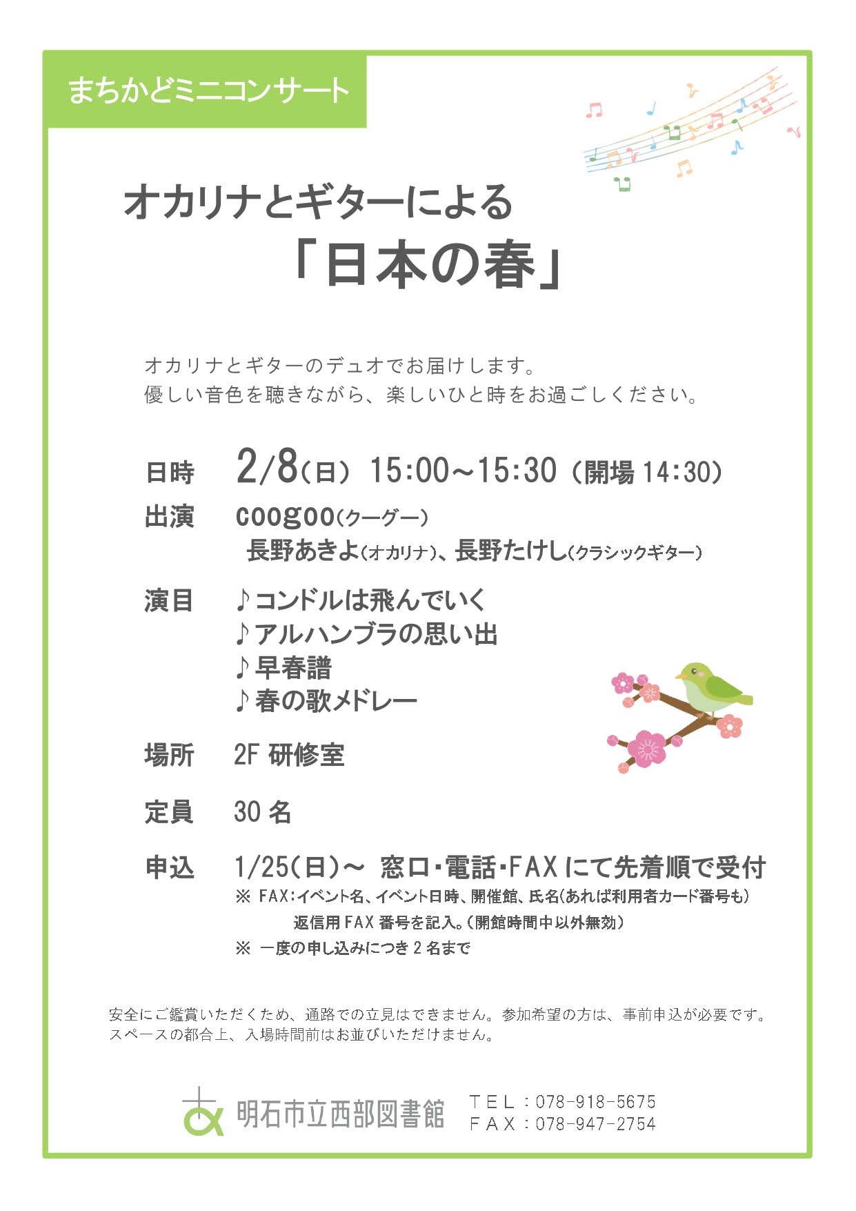 ・ 2月8日(日) 西部市立図書館にて 15:00~ オカリナとギター「coogoo」予約制